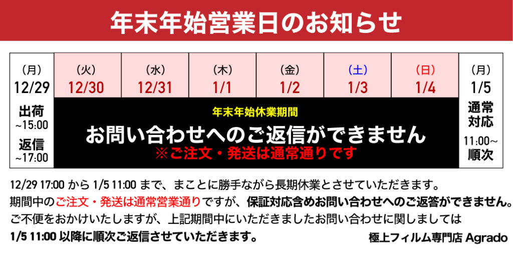 期間中のご注文・発送は通常営業通りですが、保証対応含めお問い合わせへのご返答ができません。