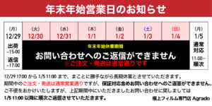 いつも当店をご利用いただきありがとうございます。 誠に勝手ながら、下記の日程については年末年始の長期休業とさせていただきます。 ■休業期間(お問い合わせ対応)2024/12/27(金)17:00 ~ 2025/01/06 […]