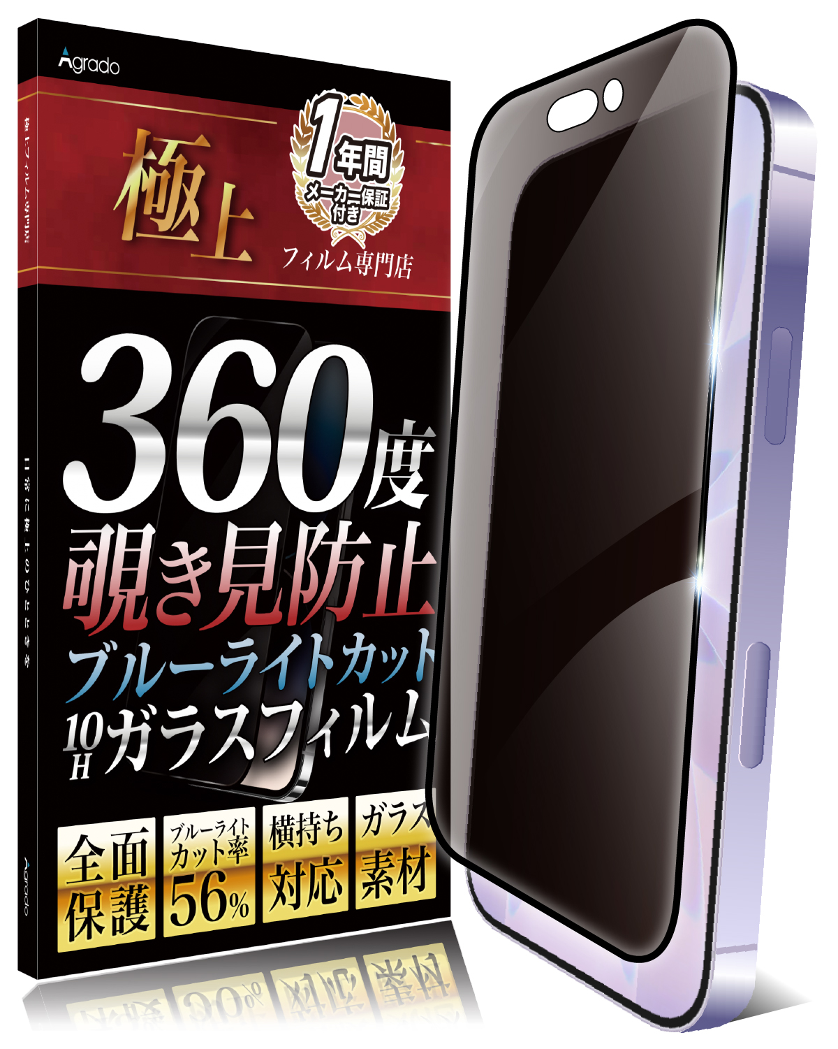 Agrado 360度 覗き見防止 iPhone15 ProMax 用 ガラスフィルム 10H 全面保護 いphone15promax フィルム ブルーライトカット