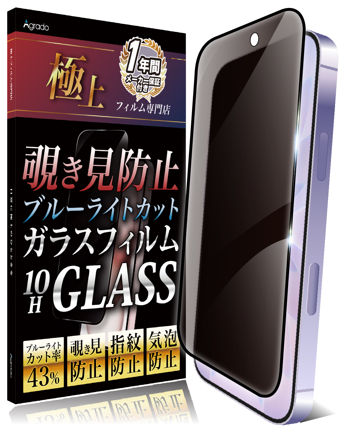 Agrado 覗き見防止 iPhone14Pro 用 ガラスフィルム 全面保護 いphone14pro 10H 保護フィルム ブルーライトカット フィルム 10H